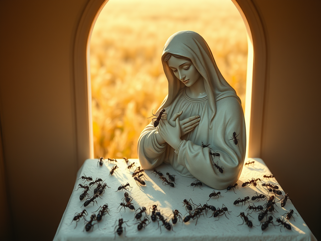 De eerste keer dat ik het zag, schrok ik me een hoedje. In de vroege ochtend was ik op pad gegaan om de veldkapel naast mijn huis te openen, een plek van stilte en gebed. Tot mijn verbijstering bleek het witte altaar volledig bedekt met vliegende mieren.